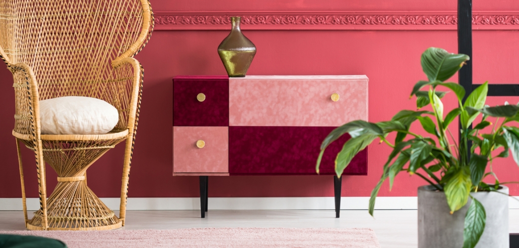 6. Egy szín három árnyalata uralja itt a teret (a negyedik a szőnyeg halványrózsaszínje). A vékony lábakon álló komód fiókjainak márványos mintája kiválóan érvényesül a mögötte álló fal ütős színe előtt. Az már a hab a tortán, hogy a falat nem a bordűrig, hanem azon túl mázolták le festőhengerrel.