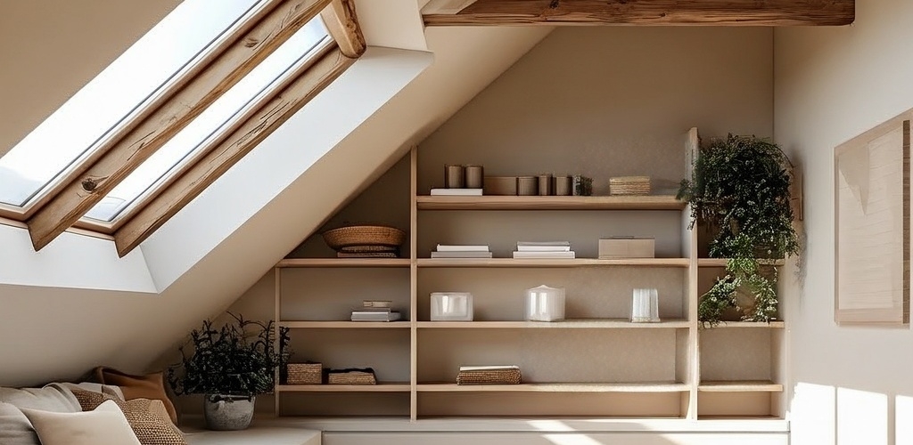 1. Semmiféle méricskélést és pontos méretre készítést nem igényel, ha a tető dőlésszögét nagyjából követő, lépcsőzetes polcot állítunk be a csapott falsík mellé, a függőleges falra.