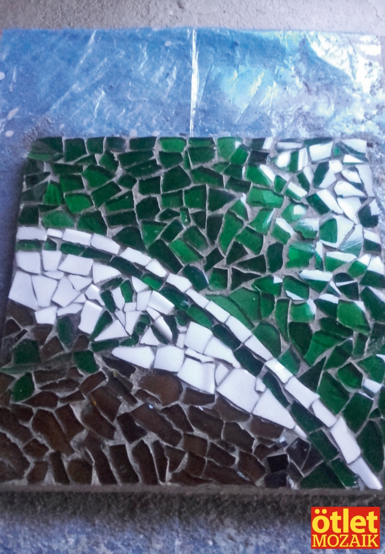 A különböző üvegeket előbb összedarabolja. Az átlátszó üvegből szürke szín lesz, a zöld és barna színt sörös- vagy borosüvegek szolgáltatják, a fehér pedig általában tányér. Ezeket az apró üvegdarabokat aztán minden papírrészlet levétele után, a megfelelő részletbe rakosgatja.